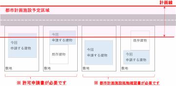 都市計画施設(道路・公園など)等の予定区域内において建築物の建築をしようとする場合は、都市計画法第53条第1項の規定により、許可を受けることで建築物を建築することができます。